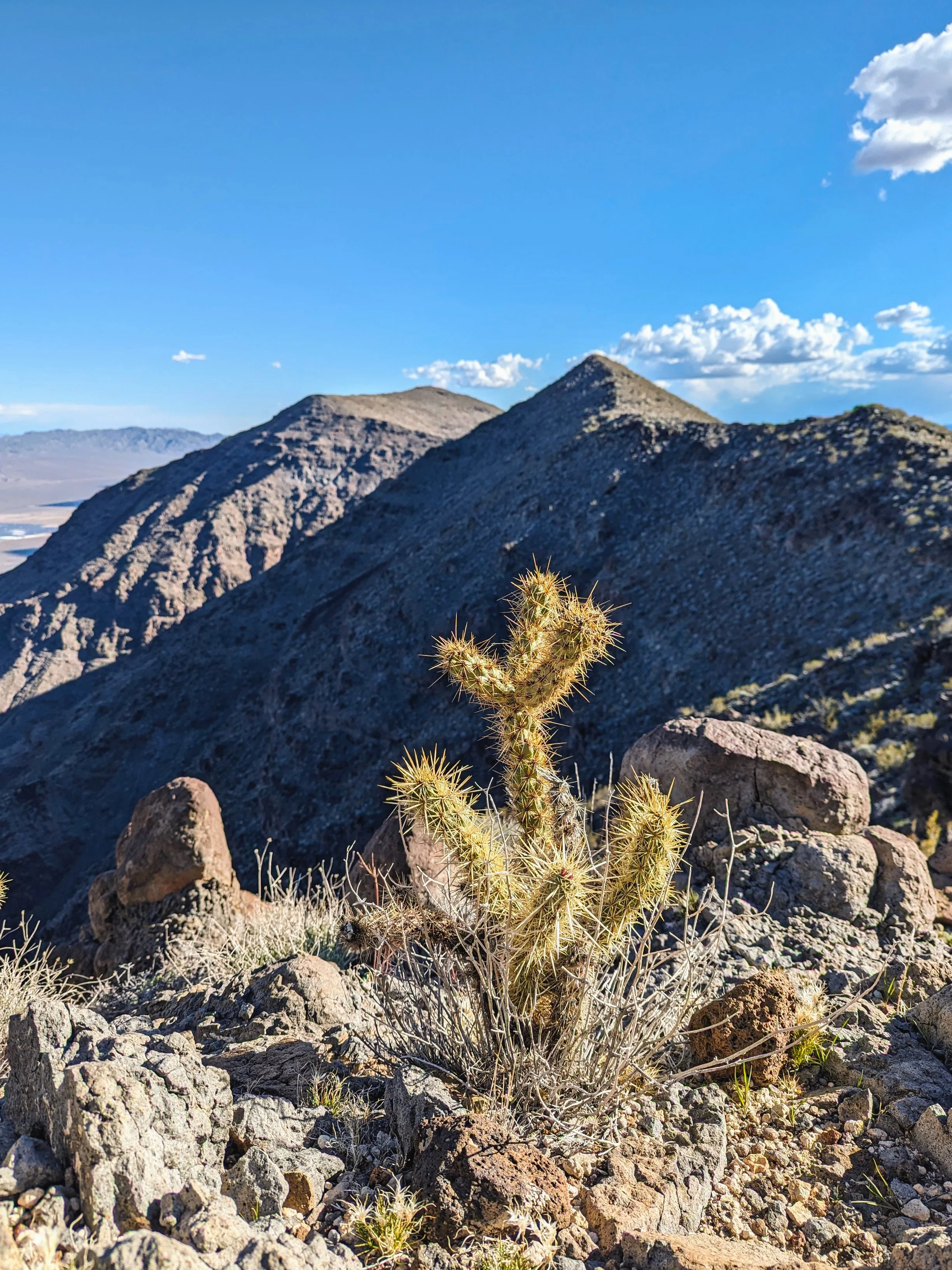 All Alone: just like this cholla cactus, I was all alone in the mountains. This relatively remote, unforgiving terrain pretty much ensures whomever comes up here will have this place all to themselves.