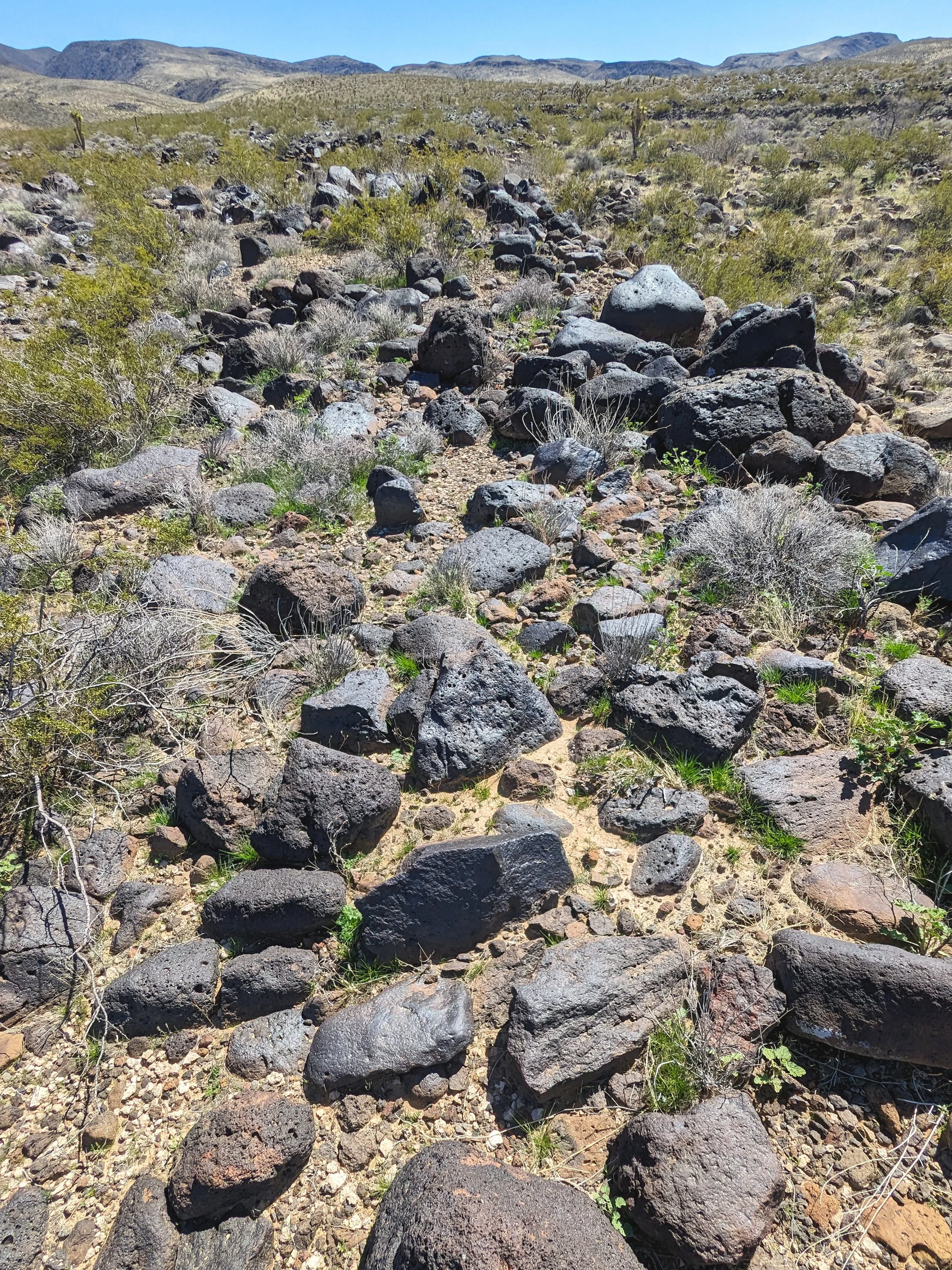 Tread Lightly: the terrain in this section of the Mojave Desert is unrelenting and filled with an endless talus of basalt rocks and really sharp, pokey things everywhere you step.